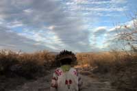 La culture wixárika (aussi connue sous le nom huichol) s’étend principalement dans les États de Jalisco, Nayarit et Durango au Mexique. C’est une culture millénaire qui a pu au fil du temps maintenir vivante sa cosmogonie centrée autour de l’eau, du feu, du cerf et du dieu hikuri (peyote) qui « est pour nous la bible des métisses », raconte en substance le chaman Andrés Carillo. À la différence d’un documentaire ethnographique ordinaire reposant sur la mise à distance de la société humaine filmée, Flores en el desierto est davantage une chronique initiatique. Les wixárikas s’approprient le film afin de transmettre et partager leur culture en un temps où la modernité se montre à son égard intolérante.