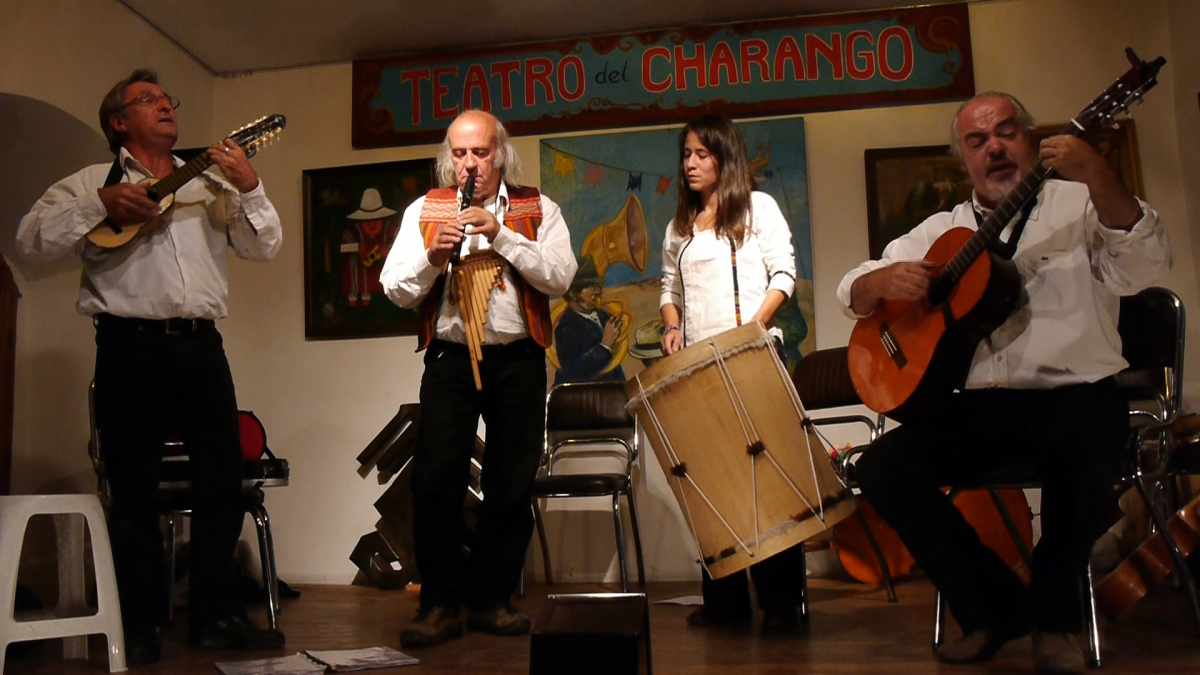 Il chante, joue charango, guitare, bombo et zamponas.