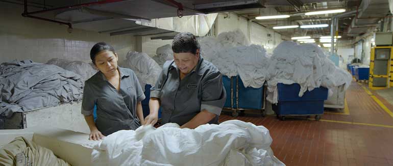 La caméra la suit dans les dédales de l’hôtel, dans ses allers et venues, dans son travail rythmé par les départs et les arrivées des clients. Une histoire de solitudes, des histoires de femmes, de travailleuses invisibles au service des élites. Dans un style épuré, on suit cette femme qui lutte et qui serre les dents pour rester debout, jusqu’au bout.