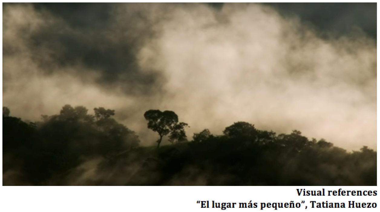Le traitement est conçu comme un tissage entre « par-là » et « ici ». L’« ici» est l’espace de l’exil où Carabalí habite au moment, qu’on ne pourrait localiser. Ce sont les lieux où il habite, qui lui sont étrangers, cachés. Le « par-là » représente sa communauté, les souvenirs vivants de sa mémoire : l’image de ce dont il a très envie et qui lui manque le plus, les voix de sa famille et des gens qu’il aime qui le rappellent à lui-même et le maintiennent dans sa vie quotidienne.